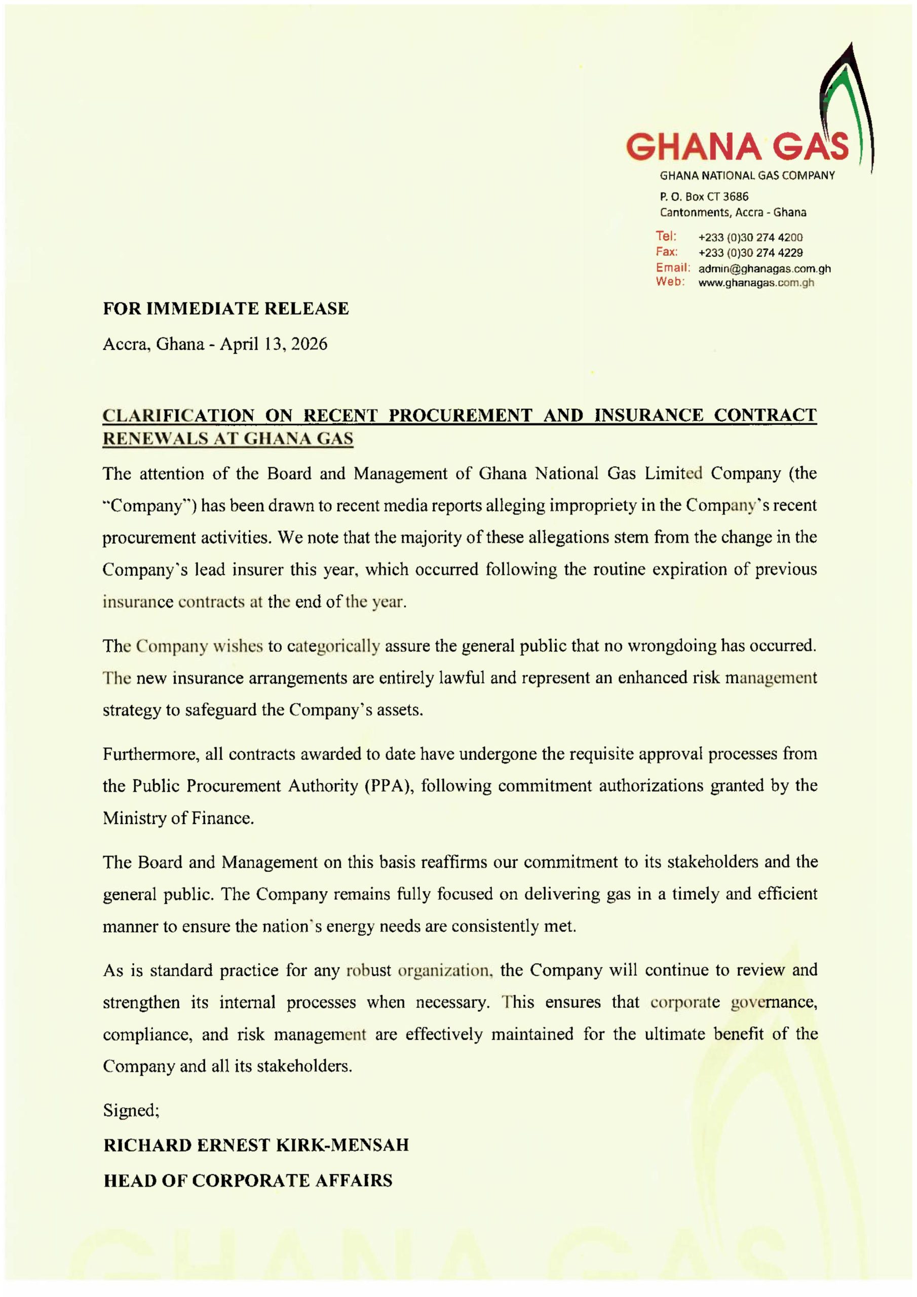The management of Ghana National Gas Limited has refuted allegations of misconduct regarding recent modifications to its insurance arrangements, asserting that all procedures were executed in accordance with the law.