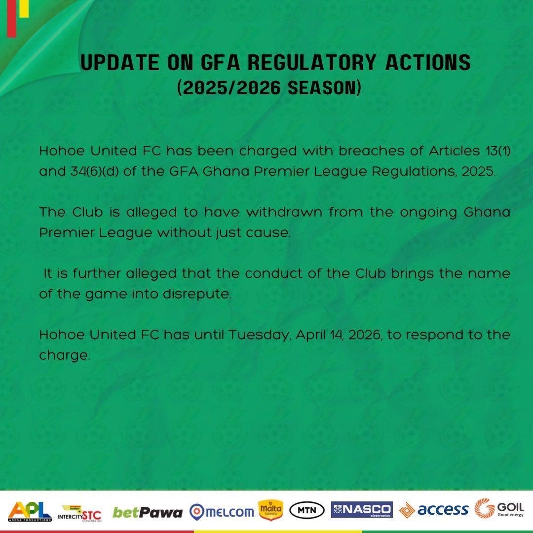 The GFA, in their statement, has given Hohoe United until Tuesday, April 14, to respond to the charges as disciplinary proceedings commence. The association emphasized its commitment to upholding the integrity of the competition and warned that further sanctions could be imposed depending on the club’s response.